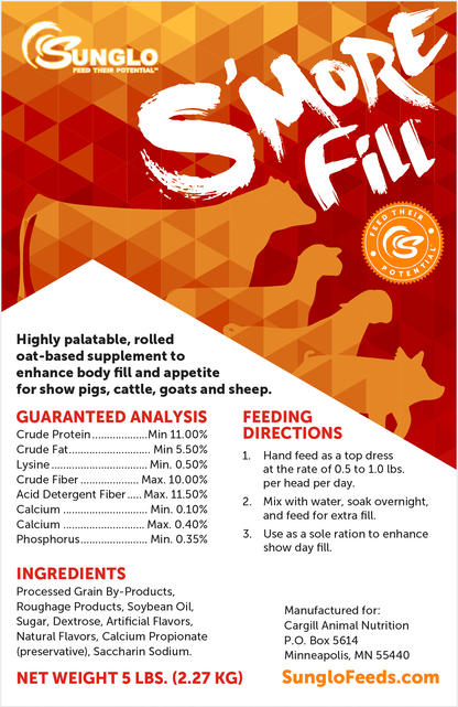 S'more Fill, commonly referred to as "S'mores", works especially well on animals intended for show that need a fuller, fresher appearance through their mid-rib and flank area. S'more Fill is incredibly palatable and general intake is often improved when S'more Fill is added to either a complete feed ration or as the sole ration on show day. Can be fed to pigs, cattle, goats and sheep and can be fed as a replacement of rolled oats.